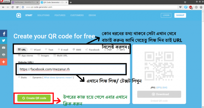 এবার খালি ঘর এ আপনার লিঙ্ক অথবা আপনার লিখা/টেক্সট লিখুন। আমি আমার ফেসবুক এর লিংক দিলাম। এবার ”create QR code” এ ক্লিক করুন।