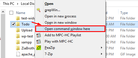২. এখন todo folder টি সিলেক্ট করা অবস্থায় কী-বোর্ড থেকে ctrl+shift চেপে ধরে todo folder টির উপর মাউসের right click করুন। অতপর popup menu খেকে open command window here এ ক্লি করুন।