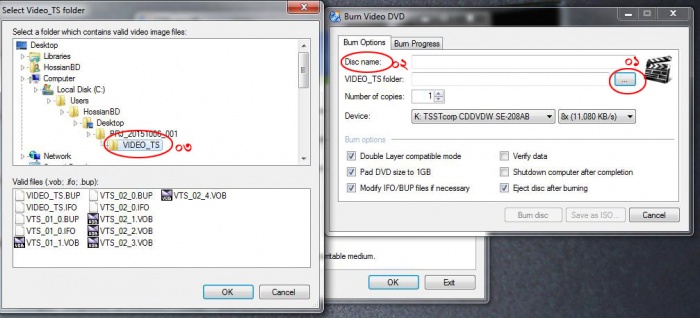 এবার VIDEO_TS folder এ আপনার কপি করা ডিভিডি টি দেখিয়ে দিন, উপরের মত কাজ করুন। সব কিছু ঠিক থাকলে Burn dice এ ক্লিক করুন।