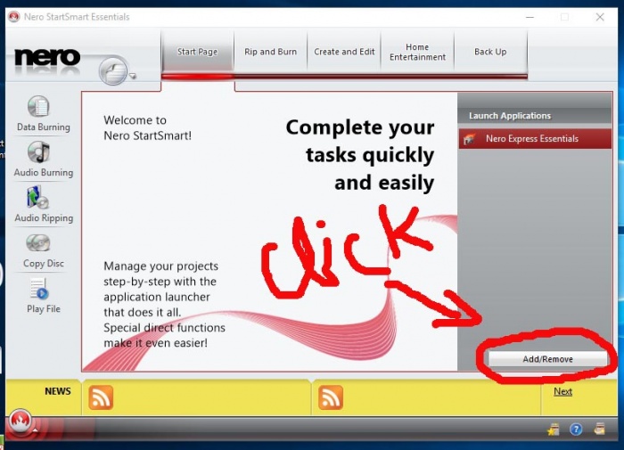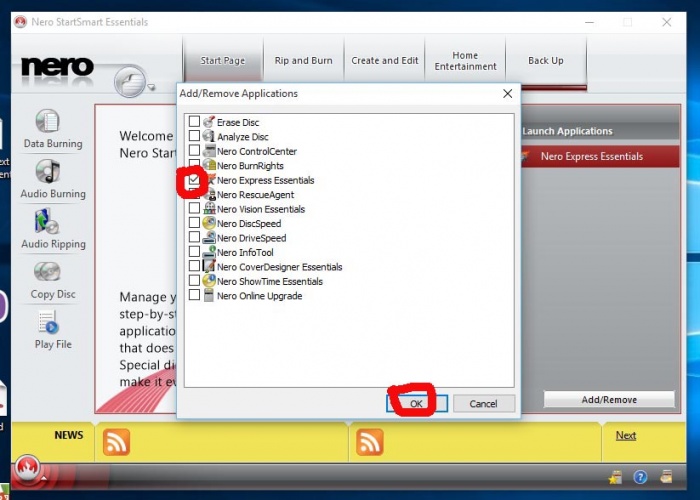Add/Remove Option এ Click করি, এবার নতুন Option আসবে সেখানে Nero Express Essentials Menu তে Click করি তার পর Ok তে Click করি