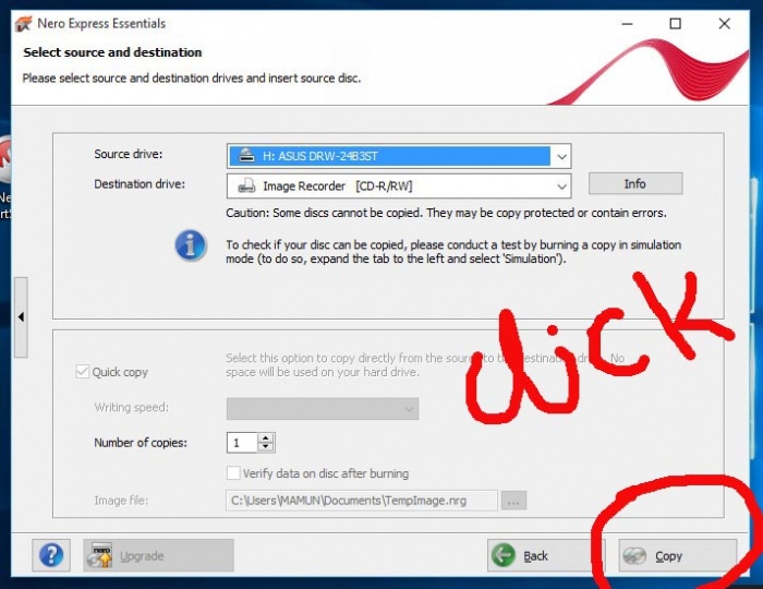 সেখানে Source Drive আপনার Drive টি নির্বাচন করুন এবং Destination Drive a Image Recorder টি নির্বাচন করুন এবার Copy তে Click করি এবার Save Option আসবে সেখানে Save as type এর Down Arrow তে Click করে ISO Image Files(*.iso) নির্বাচন করি। যা নিম্নের ছবির মত