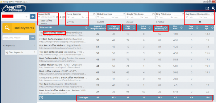 Average Keyword Competitiveness – 45: এভারেজ কম্পিটিটিভনেস বা কেসি (KC) হচ্ছে লং টেইল প্রো সফটওয়্যারের একটা হিসাব। একটা কীওয়ার্ডের কম্পিটিটর এনালাইজ করে লং টেইল প্রো ০ থেকে ১০০ পর্যন্ত একটা মার্ক দেয়। শুধুমাত্র এই কেসি দেখেই আপনি সিদ্ধান্ত নিতে পারবেন এই কীওয়ার্ড নিয়ে কাজ করবেন কি করবেন না? আমরা দেখছিলাম “Best Coffee Maker” কীওয়ার্ডটি। এই কীওয়ার্ডের কেসি দেখাচ্ছে ৪৫। অর্থাৎ এটি মোটামুটি একটা হার্ড কীওয়ার্ড। নিচের ছবিটি দেখে কেসি সম্পর্কে বিস্তারিত ধারণা নিতে পারবেন: