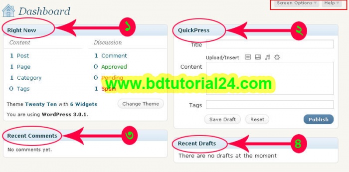 উপরের অপশন গুলোই মেইন অপশন । এসারা আপনি স্কিন অপশন [ছবির উপরে লাল করা ]থেকে আর অনেক নতুন অপশন যোগ করতে পারবেন । যেমন Incoming Links , Plugins , WordPress Blog । এছারা help অপশন [ছবির উপরে লাল করা ] থেকে ড্যাশবোর্ড এর যেকোন সমস্যার সমাধান পাবেন WordPress Forum থেকে ।