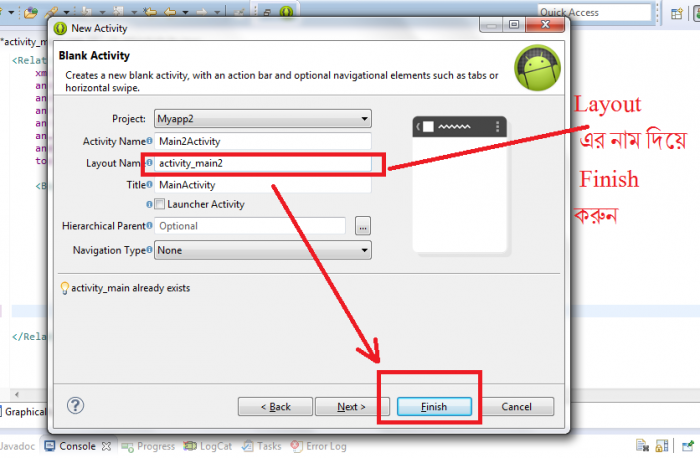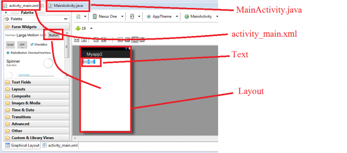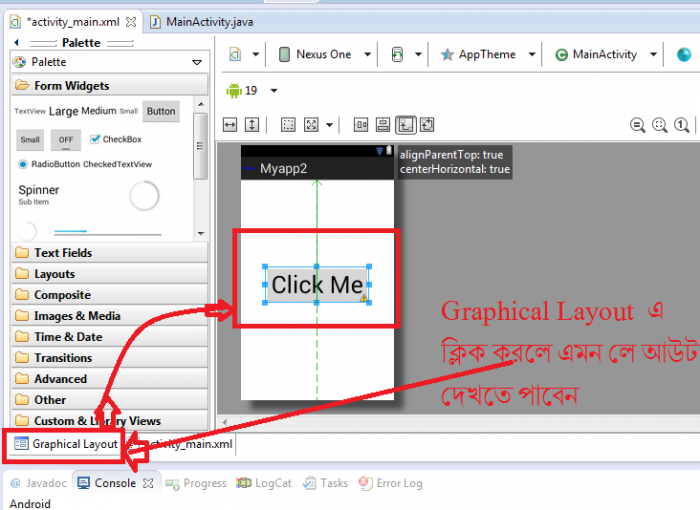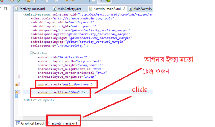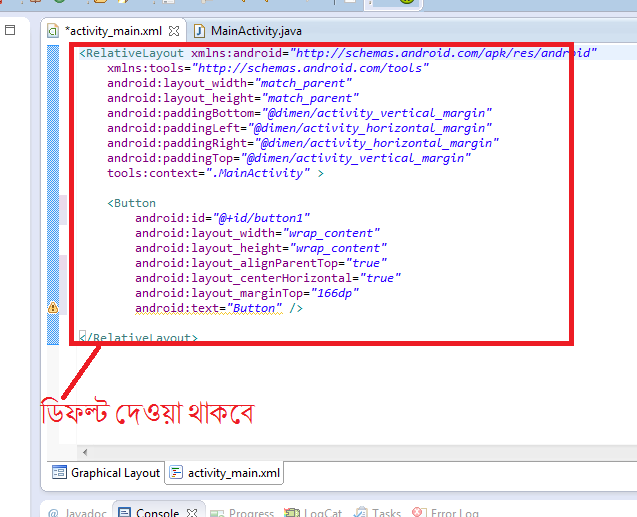 এর পর আমরা স্ক্রিনের নিচের দিকে acitivity_main.xml এ ক্লিক করবো তাহলে নিচের মতো স্ক্রিন পাবো।