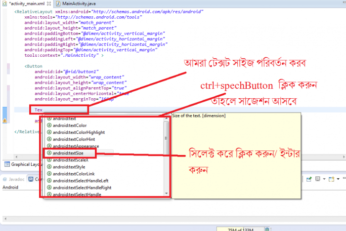 এবার আমরা নিচের ছবির মতো TextSize Change করবো, এর জন্য শূধু Tex লিখে ctrl+spech বাটনে ক্লিক করলে লাইব্রেরী থেকে সাজেশান আসবে। আমারা বেছে দেখে সিলেক্ট করবো,