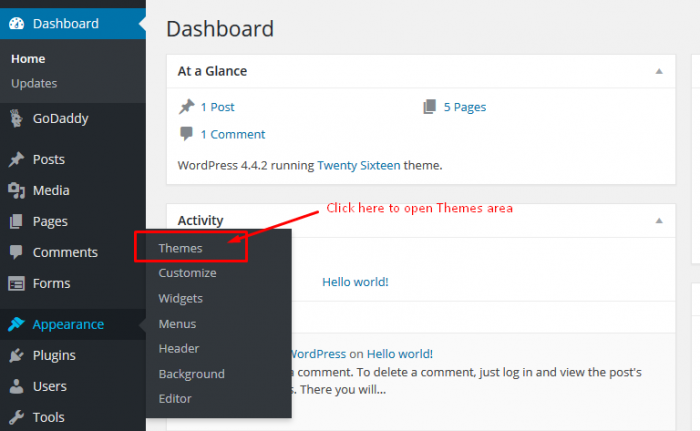 যদি আপনি নতুন থিম বা ডিফল্ট থিমের পরিবর্তে অন্য থিম ব্যবহার করতে চান তাহলে সেটা ইনস্টল করতে হবে “Appearance” অংশ থেকে। নিচের ধাপগুলো খেয়াল করুন: