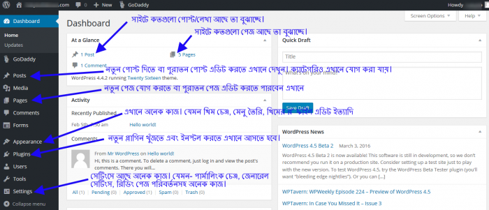 উপরের স্ক্রিনশটটা ভালো করে দেখে নিন। তাহলেই আপনার সাইটের এডমিন প্যানেল সম্পর্কে একটা ক্লিয়ার ধারণা পেয়ে যাবেন। কিছু বুঝতে সমস্যা হলে প্রশ্ন করতে ভুলবেন না। আশা করি আপনার প্রশ্নের সমাধান দিতে পারবো।