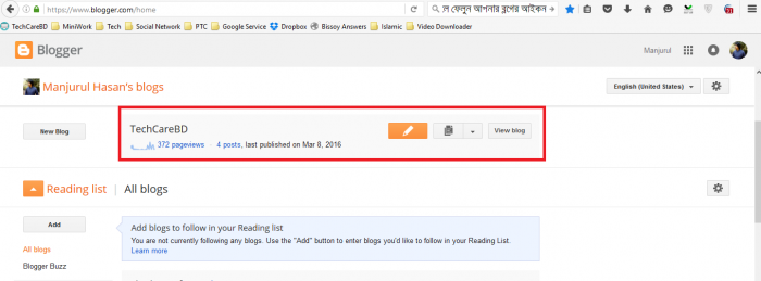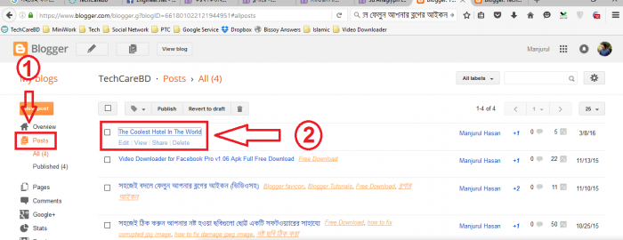 চলুন শুরু করা যাক, প্রথমে ব্লগারে যান, আপনার ব্লগের নামের উপর ক্লিক করে ব্লগের ড্যাশবোর্ডে প্রবেশ করেন,