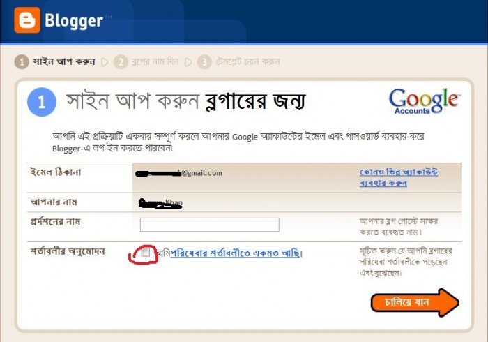 এখানে আপনার ইমেইল ঠিকানা ,নাম দেখানো হবে।এছাড়াও আরেকটি ঘর খালি থাকবে সেটি হচ্ছে প্রদর্শনের নাম।এটি আপনি কি নামে পোস্ট প্রকাশ করতে চান সেটি যেমন এই পোস্ট আমি প্রকাশ করছি নিশাচর নাইম নামে।এরপর শর্তাবলীর অনুমোদন এর ঘরে টিকমার্ক দিয়ে চালিয়ে যান এ ক্লিক করুন।