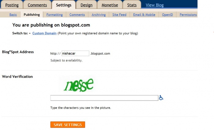 এই ট্যাবে ২ টি সেটিংস দেখতে পাবেন।প্রথমটি হল ব্লগকে কাস্টম ডোমেইনে স্থানান্তরিত করা এবং দ্বিতীয় হল বর্তমানে যে ডোমেইন চলছে সেটি পরিবর্তন করে অন্য আরেকটি তে প্রকাশ করা।ব্লগকে কিভাবে কাস্টম ডোমেইন এ নিতে হয় সেটি পরবর্তীতে আলোচনা করব। আপনি যদি ব্লগের বর্তমান ঠিকানা যদি কোন কারণে পরিবর্তন করতে চান তাহলে প্রথমে জায়গায় কাঙ্ক্ষিত নামটি লিখে নিচে দেওয়া ওয়ার্ডগুলা সঠিকভাবে লিখে(ক্যাপচা) SAVE SETTING এ ক্লিক করলে যদি নামটি খালি থাকে তাহলে সেটিতে পরিবর্তন হয়ে যাবে।যদি ঠিকানাটি খালি না থাকে তাহলে Sorry, this blog address is not available এই লেখাটি আসবে।পুনরায় নতুন নাম দিয়ে চেষ্টা করুন।