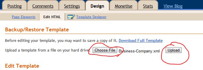 এবার Edit HTML এ গিয়ে Choose File এ ক্লিক করে আপনার কম্পিউটারের রাখা টেম্পলেট টি সিলেক্ট করে Upload বাটনে ক্লিক করলেই নতুন টেম্পলেটে ব্লগ ডিজাইন পরিবর্তন হয়ে যাবে।এবার View Blog এ ক্লিক করলে দেখবেন আপনার ব্লগটি নতুন টেম্পলেটে পরিবর্তন হয়ে গেসে।তবে অবশ্যই আগের টেম্পলেটটির ব্যাকআপ রাখবেন।আগের টেম্পলেটটি পুনঃস্থাপিত করার জন্য উপরোক্ত নিয়ম একইভাবে ফিরে যাওয়া যাবে।