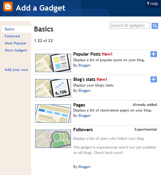 সেখানে Popular Post,Blog Stats,Pages,Followers,Search Box,HTML/Javascript ইত্যাদি Gadget দেখতে পাবেন।এখান থেকে প্রয়োজনীয় Gadget যোগ করার জন্য এগুলোর পাশে (+) চিহ্নতে ক্লিক করুন।