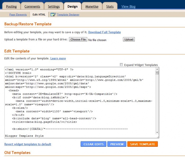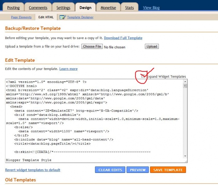 এছাড়াও Edit Template অপশানে আপনার ব্লগ এর টেম্পলেট এর কোডসমুহ সংক্ষিপ্ত আকারে দেখতে পাবেন।পুর্নআকারে দেখতে চাইলে কোডবক্স এর কোণায় Expand Widget Templates এ ক্লিক করুন।