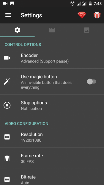 অ্যাপটির বেসিক সেটিংস এবং অপশনস সম্পর্কে একটু ধারনা দেই। প্রথমত অ্যাপটিতে ভিডিওর ২ ধরনের এনকোডার আছে। এনকোডার Advanced রাখাই ভালো কারন এতে আপনি ভিডিও করার সময় ভিডিও পজ/প্লে করতে পারবেন।