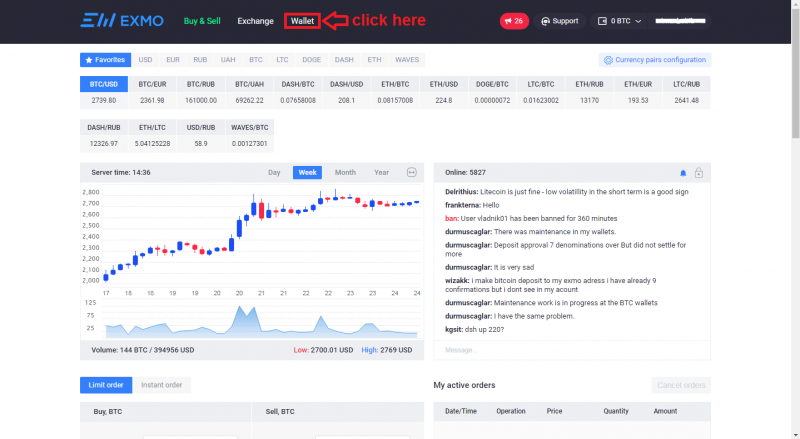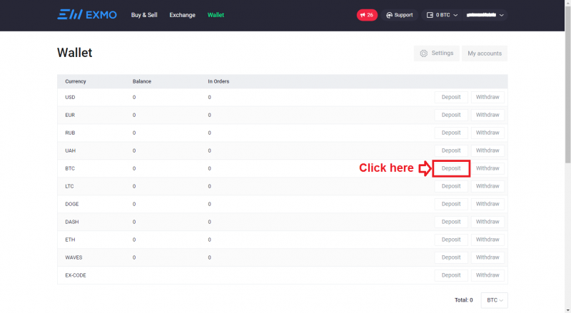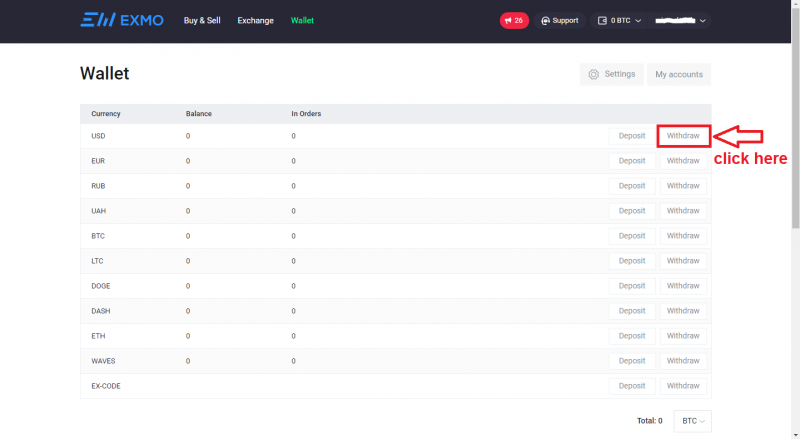 প্রথমে এখানে ক্লিক করে EXMO সাইটে sign up করে নিন। এবার sign up এর পরে sign in করে নিচের ছবির মত একটা পেজ দেখতে পাবেন। নিচের ছবির মত Wallet এ ক্লিক করুন।