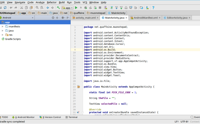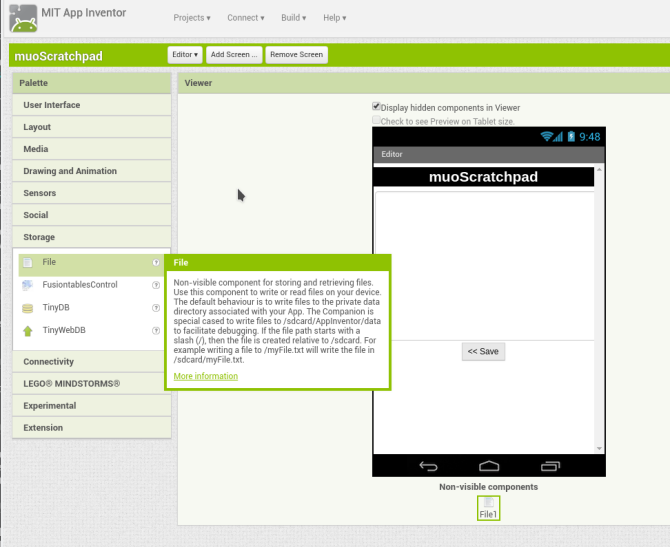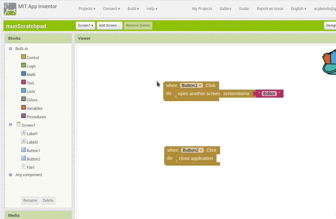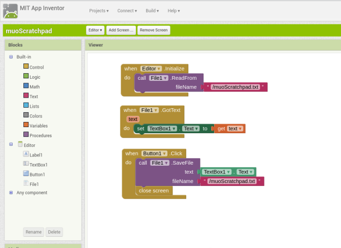 আরো কিছু ছোটখাট কাজ করে ফেলতে হবে Editor > when Editor.initialize ব্লকের উপর call File1.ReadFrom নিয়ে আসতে হবে। File > when File1.GotText করতে হবে TextBox > set TextBox.Text to এর উপর। এখন সেভ করার পরে মেইন মেনুতে ফিরিয়ে নিয়ে যাওার জন্য Back To Main Menu নামের আরেকটি বাটন এড করতে হবে।
