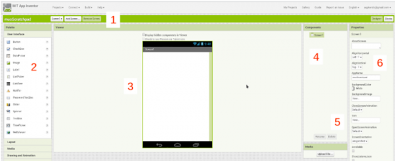 2) বামপাশের সাইডবারে এখানে সকল ধরনের টুল আছে এপ টৈরীর জন্য যা যা লাগবে। 3) কি ফ্যাশনে এপ তৈরি করা হচ্ছে সেটা দেখাবে। এপে যা কিছু এড করতে হবে তার সবকিছু এখানে ড্র্যাগ করে আনতে হবে। এটা এপের মূল স্ক্রীণ। 4) ইতিমধ্যে এপ স্ক্রীণে (3 নম্বর এর স্ক্রীণে) কি কি এড করা হয়েছে সেটা দেখায়। 5) ইমেজ, সাউন্ড বা ভিডিও ক্লিপ এড করার জন্য এটা ব্যবহার করা হয়। 6) প্রপার্টিস থেকে সিলেক্টেড থাকা যেকোন টুল বা জিনিস এর বিভিন্ন পরিবর্তন করা যায়।
