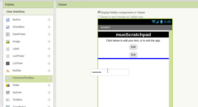 এখন আবার ডিজাইনারে ফেরত গিয়ে নতুন একটি স্ক্রীণ তৈরী করতে হবে। এবং সেখানে একটি টেক্সটবক্স তৈরী করতে হবে আর তার নিচে Save নামে আরেকটি বাটন। আর তারপর Display hidden components in Viewer চেকবক্সে টিক দিয়ে দিন।