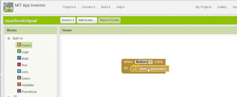 এখন Built-in > Control সেকশনে গিয়ে close application নামে যে ব্লকটা আছে সেটা ড্র্যাগ করে আগের when Button2.click এর উপর এনে ছেড়ে দিতে হবে।
