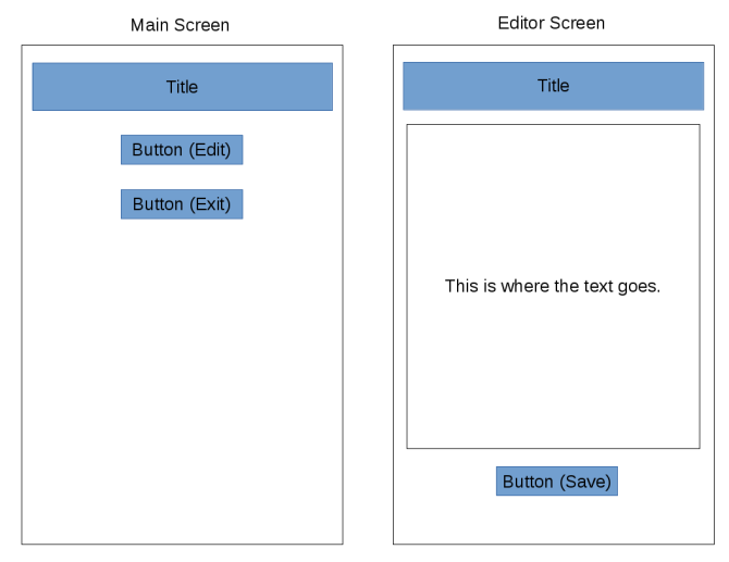 আমরা একটা সিম্পল এপ ডেভেলাপ করব। মাত্র দুটি স্ক্রীণ নিয়ে এপটি তৈরী করব। যার প্রথম পেজটি হবে হোমপেজ। হোমপেজে বাটন থাকবে দুটি। একটি হল Exit আর আরেকটি হল Edit। আর দ্বিতীয় পেজটি হবে Edit এর। যেখানে টেক্সট লেখা বা টাইপ করা এবং সেভ করা যাবে। প্লেইন টেক্সট হিসেবে লেখা হবে এবং সেভ হবে।