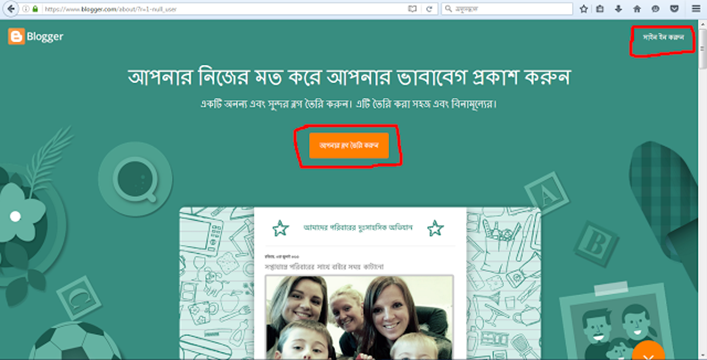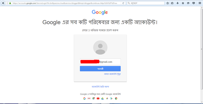 Blogger ব্যবহার করে ব্লগ তৈরি করতে চাইলে প্রথমেই প্রয়োজন জিমেইল একাউন্টের। Gmail একাউন্ট না থাকলে করে নিন। Gmail থাকলে বা করে নেবার পর এখানে ক্লিক করুন। ক্লিক করার পর আপনি নিচের মত পেজ দেখতে পাবেন। যদি আপনার কোন জিমেইল একাউন্ট না থাকে তাহলে 'আপনার ব্লগ তৈরি করুন' অথবা জিমেইল একাউন্ট থাকলে 'সাইন ইন করুন' এর উপর ক্লিক করুন।