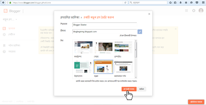 *ঠিকানা ঘরে ব্লগের জন্য উপলভ্য একটি ঠিকানা দিন(এটিই হবে আপনার ব্লগের URL এড্রেস)। তারপর ইচ্ছামত থিম সিলেক্ট করে 'ব্লগ তৈরি করুন' এর উপর ক্লিক করুন।