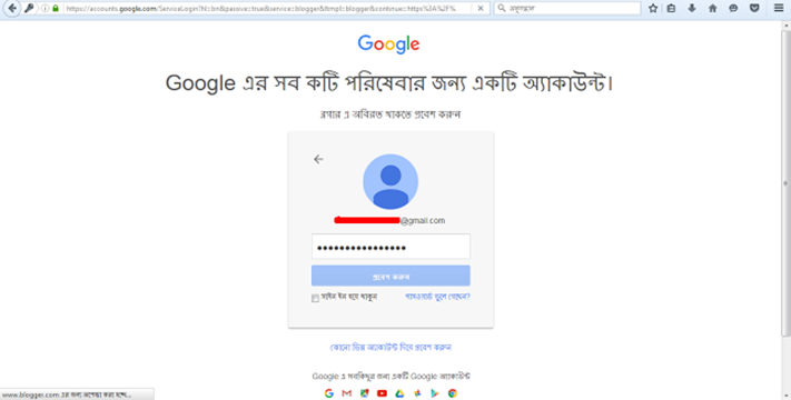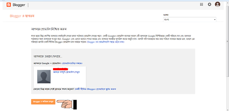 সাইন ইন করার পর আপনার প্রোফাইল নিশ্চিত করতে বলবে ভাষা ও অন্যান্য সেটিংস ঠিক করার পর 'ব্লগার এ অবিরত রাখুন' এর উপর ক্লিক করুন।