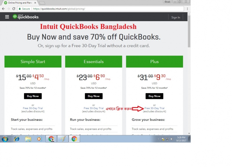 Free Trail এ ক্লিক করার পর নিম্নের চিত্রটি দেখতে পাবেন। আমরা কুইকবুকস অনলাইন Plus এ সাইন -আপ করব। কারণ Plus এ Simple Start এবং Essentials এর সব Features অন্তর্ভুক্ত। তাই নিম্নের চিত্রের মত Plus এর Free 30-Day Trial এ ক্লিক করুন।