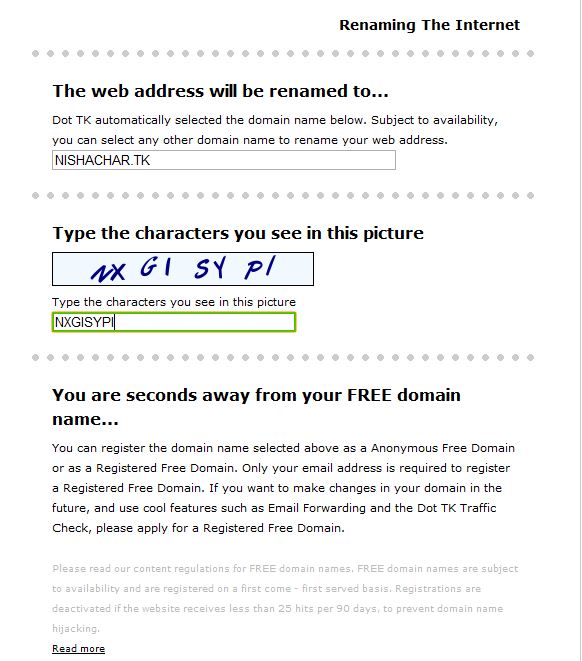 এর পর যে পেইজটি ওপেন হবে সেটি থেকে প্রথম বক্সটিতে আপনার কাঙ্খিত নামটি লিখে ক্যাপচা এর ঘরে তা সঠিকভাবে পুরণ করে একবার নিচ থেকে Registered Free Domain এর নিচে লেখা Next বাটনে ক্লিক করুন।যদি আপনার কাঙ্খিত নামটি খালি না থাকে তাহলে তা দেখাবে এবং সাথে সাথে অনেকগুলো সাজেশান দেখাবে।