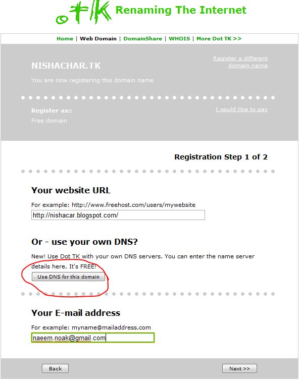 তারপর কাঙ্খিত নাম দিয়ে সার্চ করুন খালি আছে কিনা।এটা আগেগুলার মতো বিধায় বিস্তারিত বললাম না।আমি শুধু DNS সেটাপ টা বলে দিচ্ছি।ডি.এন.এস সেটাপ এবং ব্লগারে সেটাপ দিবেন নিচের চিত্রের মত।