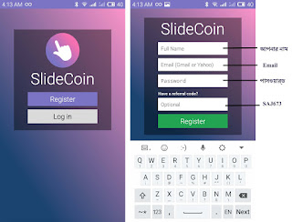প্রথমে Play Store থেকে SlideCoin নামের অ্যাপটি ডাউনলোড করুন, লিংক এখানে। তারপর অ্যাপটি ওপেন করে রেজিস্টার করুন। তার জন্য নিচের পদ্ধতি অনুসরণ করুন :