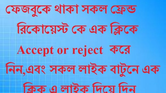 ফেজবুকে থাকা সকল ফ্রেন্ড রিকোয়েস্ট কে এক ক্লিকে Accept or reject কিভাবে করবেন, এবং সকল লাইক বাটুনে এক ক্লিক এ কিভাবে লাইক দিবেন তো আজ আর বেশি কিছু বললাম না চলুন নিজের ভিডিও টি দেখে নেওয়া যাক