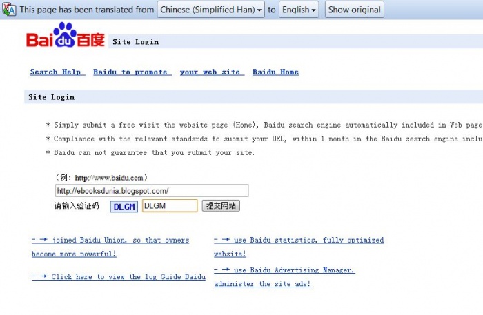 বাইদু বর্তমানে ৩ নাম্বার সর্বোচ্চ ব্যবহৃত চীনা ভাষার সার্চ ইঞ্জিন।বাইদু তে আপনার সাইট সাবমিট করার জন্য প্রথমে এখানে ক্লিক করুন।তারপর প্রথম বক্সটিতে আপনার সাইটের ঠিকানা লিখে পরের বক্সটিতে এর পাশে দেয়া নাম্বারগুলো সঠিকভাবে লিখে সাবমিট লেখাতে ক্লিক করবেন।যেহেতু সাইটটি সম্পুর্ন চীনা ভাষায় তাই গুগল ক্রোম ব্যবহার করে ট্রান্সলেট করে নিন।যারা করতে জানেন না তারা এখান থেকে ছবি দেখে সাবমিট করুন।