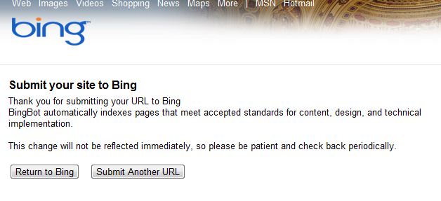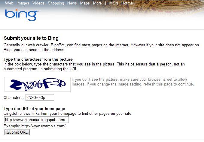 বিং মাইক্রোসফটের নিজস্ব সার্চইঞ্জিন যা আগে MSN নামে পরিচিত ছিল।বিং এ আপনার সাইট যোগ করতে প্রথমে এই লিঙ্ক এ ক্লিক করুন।তারপর সঠিকভাবে ক্যাপচা পুরণ করে Type the URL of your homepage লেখাটির নিচের বক্স এ আপনার সাইটের URL টি লিখে Submit URL এ ক্লিক করুন।সাথে সাথে আপনার সাইট বিং এর খাতায় যোগ হয়ে যাবে।