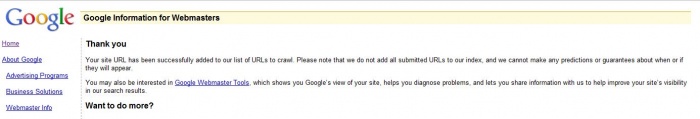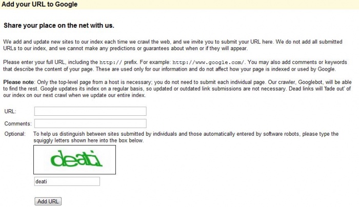 গুগলে সাইট সাবমিট করার জন্য প্রথমে এখানে ক্লিক করুন।তারপর নিচের চিত্রের মত ওপেন হওয়া পৃষ্ঠায় URL এর জায়গায় আপনার ব্লগের ঠিকানা (http:// সহ), কমেন্ট(Comments) এর জায়গায় আপনার ব্লগ সম্পর্কে কিছু লিখে ক্যাপচা সঠিকভাবে পুরন করে Add URL বাটনে ক্লিক করুন।ব্যাস আপনার সাইট গুগল ইনডেক্স এ যোগ হয়ে গেসে।এছাড়া গুগলের আরো কিছু টুলস আছে যেগুলো ব্যবহার করে আপনার ব্লগকে সার্চ লিষ্টে আরো ভাল অবস্থানে নিয়ে যেতে পারবেন।সেগুলো সম্পর্কে পরে একটা টিউন করার ইচ্ছা আছে।