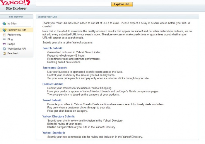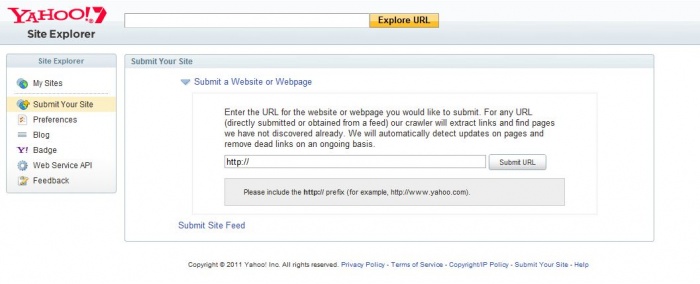 ইয়াহুতে সাইট সাবমিট করার জন্য আপনার অবশ্যই একটি ইয়াহু মেইল একাউন্ট লাগবে।প্রথমে এখানে ক্লিক করুন। এরপর Submit a Website or Webpage এ ক্লিক করে Add URL এ আপনার সাইটের ঠিকানা টি লিখে Submit URL এ ক্লিক করুন।এরপর আপনাকে আপনার ইমেইল টি দিয়ে লগিন করলেই আপনার সাইটটি ইয়াহু সাইট ডিরেক্টরিতে যোগ হয়ে যাবে।