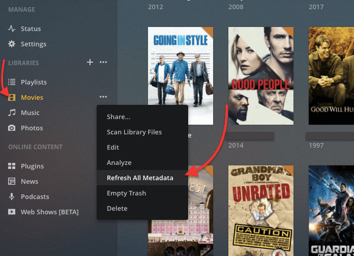 পরিশেষে, লাইব্রেরির metadata রিফ্রেশ করুন, যাতে করে চেঞ্জ গুলো সিস্টেম বুঝতে পারে। রিফ্রেশ করতে আপনার Movies লাইব্রেরি মেনুতে গিয়ে থ্রি ডট মেনুতে ক্লিক করে ড্রপ ডাউন মেনু থেকে “Refresh all Metadata” তে ক্লিক করুন।