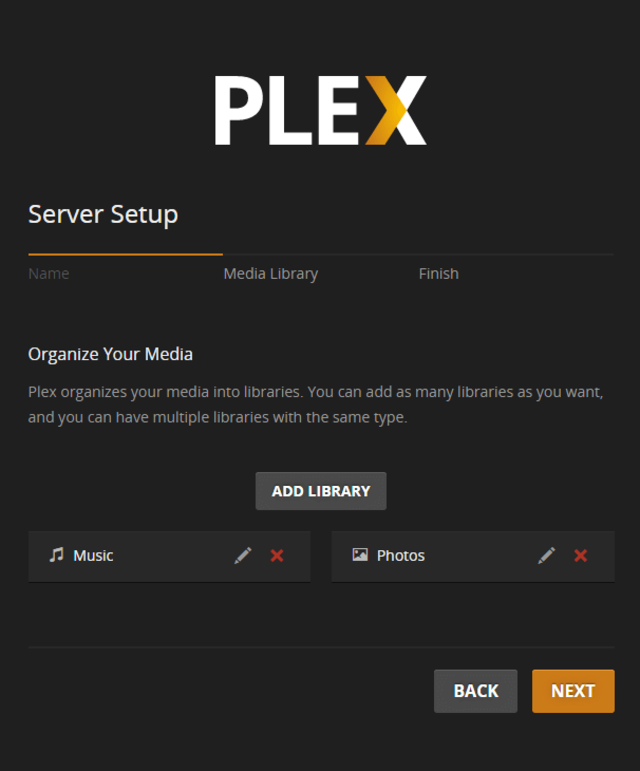 একটি লাইব্রেরি হচ্ছে অনেকগুলো মিডিয়া ফাইল এর গ্রুপ। আপনি আপনার লাইব্রেরি নিজেই সেট করতে পারবেন, উদাহরণস্বরূপ, একটি মিউজিক অথবা মুভির লাইব্রেরি। যে কোন সংখ্যা এবং ভ্যারাইটির লাইব্রেরী আপনি Plex এ তৈরি করতে পারবেন। আর আপনি ইচ্ছা করলে আপনার মিডিয়া কালেকশন ইনস্টলেশনের সময় অ্যাড করতে পারবেন অথবা পরবর্তীতে এটি চেঞ্জ করতে পারবেন। নতুন লাইব্রেরি অ্যাড করা: main dashboard অথবা Home এ যান, libraries এবং তারপর + আইকনে ক্লিক করুন।