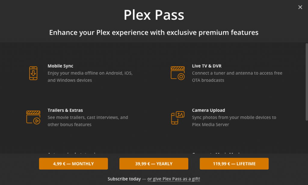 প্রিমিয়াম কিনলেই (অথবা Plex Pass) আপনি আরো উন্নত সার্ভিস উপোভোগ করতে পারবেন অতিরিক্ত কিছু অস্থির ফিচারের মাধ্যমে। Plex প্রিমিয়াম আপনাকে অনেক বেশি অতিরিক্ত ফিচার দিচ্ছে যেমন: Auto-Tagging & Places, Automatic Camera Upload, Automatic Mixes, Early Access, এবং Apps, Live TV, Lyrics, Mobile Sync, Multiple Users, Parental Controls, Photo Albums, Plex DVR, Premium Music/Photos, Timeline View, Trailers & Extras, এবং আরও অনেক অস্থির ফিচার। নিম্নে কিছু প্রিমিয়াম ফিচার সম্পর্কে আলোচনা করা হলঃ