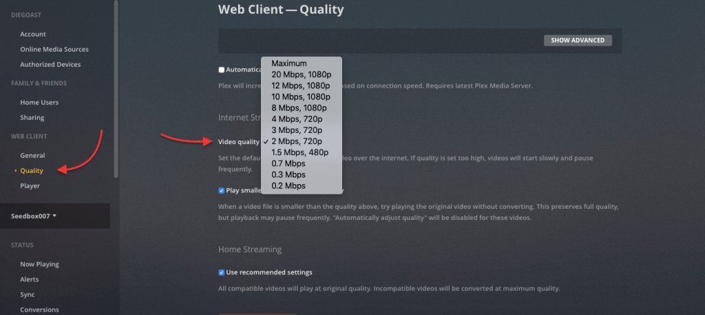 আপনি Plex Media Server থেকে local অথবা remote player এর মিডিয়া রেজুলেশনের কোয়ালিটি নির্দিষ্ট করতে দিতে পারবেন, যার ফলে সকল ডিভাইসে আপনার নির্দিষ্ট করা রেজুলেশনে মিডিয়া প্লে হবে, নিচের ছবি দেখলে আরও ক্লিয়ার হবেন। এটি করার জন্য, প্রথমে Settings এ যান > তারপর Web Client যান > Quality তে গিয়ে আপনার কাংখিত কোয়ালিটি সিলেক্ট করুন।