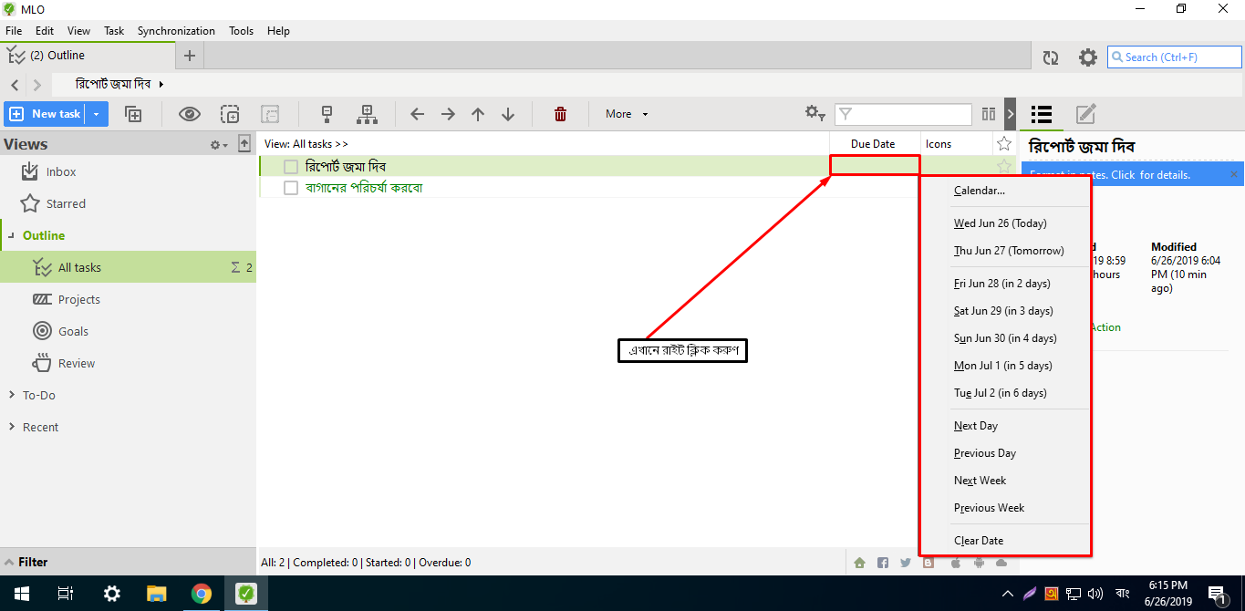 টাস্কের ডিউ ডেট সেট করাঃ ডিউ ডেট সেট করা একদম সহজ, নিচের ছবিতে লাল বক্স করা স্থানে রাইট ক্লিক করলেই ডিউ ডেট সেট করার অনেক অপশন পাবেন। সেখান থেকে আপনার পছন্দমত ডেট সিলেক্ট করুন।