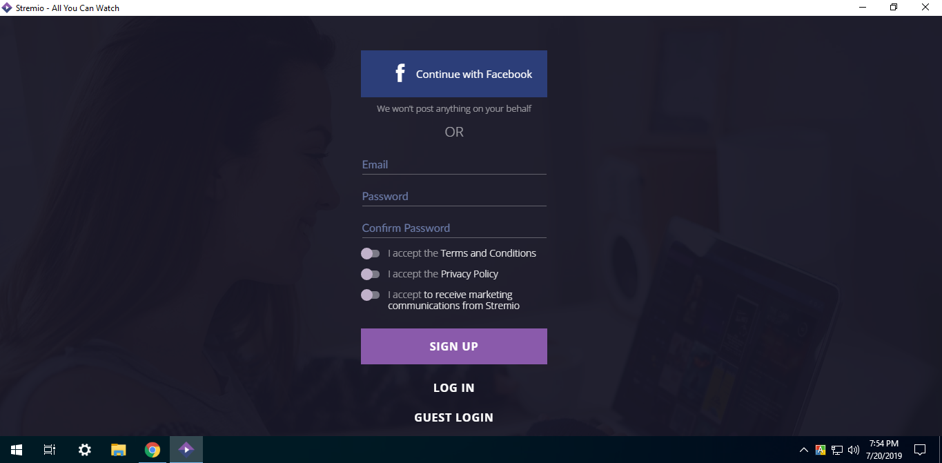 ধাপ ১ঃ আশাকরি Stremio সফটওয়্যার ইতিমধ্যে আপনারা ইন্সটল করেছেন। এখন সফটওয়্যারটি ওপেন করুন। Stremio সফটওয়্যারটি ওপেন করলে আপনারা একটি লগইন পেইজ লক্ষ করবেন। এখন আপনাদের নতুন করে অ্যাকাউন্ট তৈরি করতে পারবেন, ফেজবুক দিয়ে কানেক্ট করতে পারবেন অথবা আপনি ইচ্ছা করলে গেস্ট মুডে সফটওয়্যারে অ্যাক্সেস করতে পারবেন।