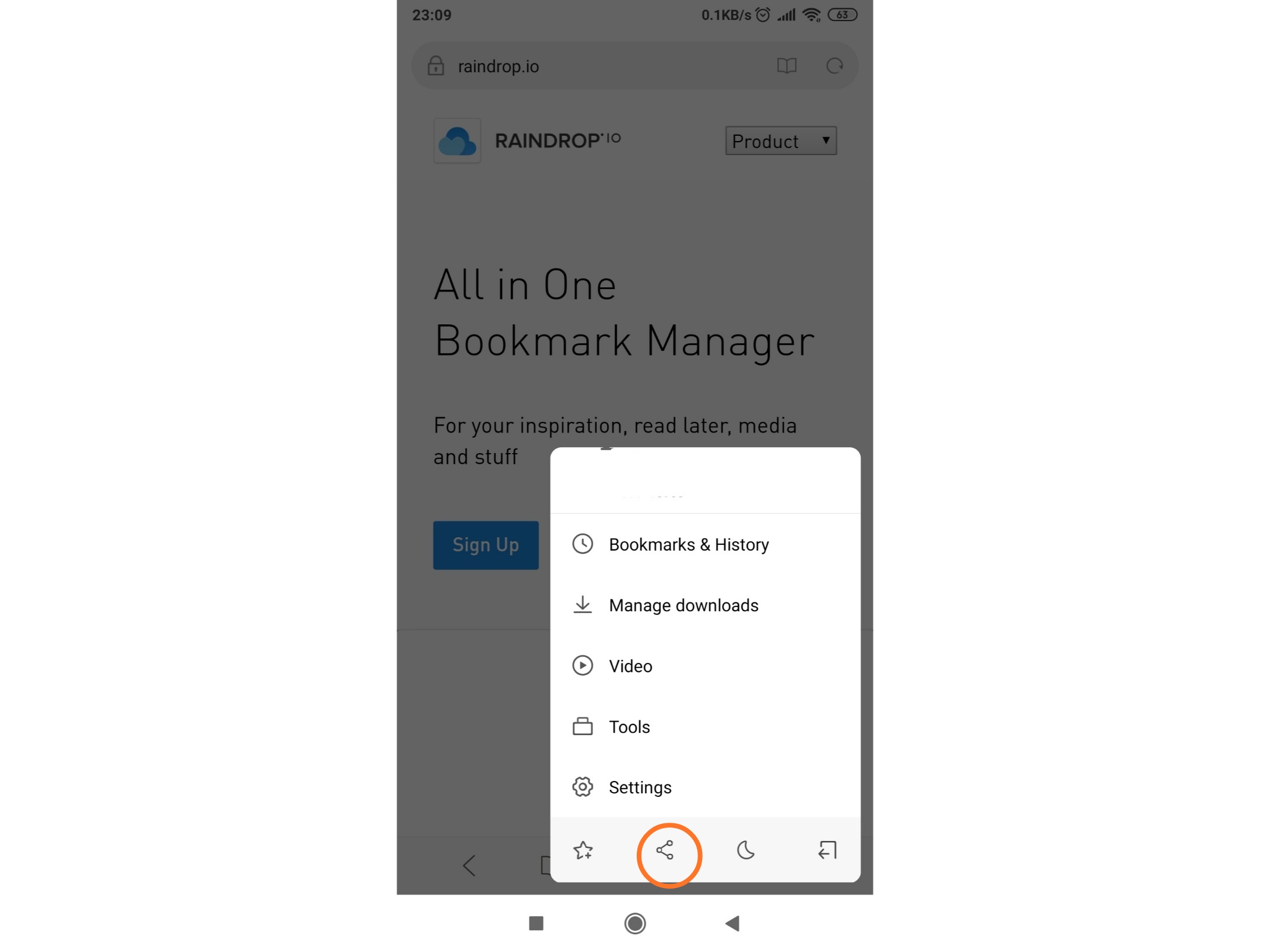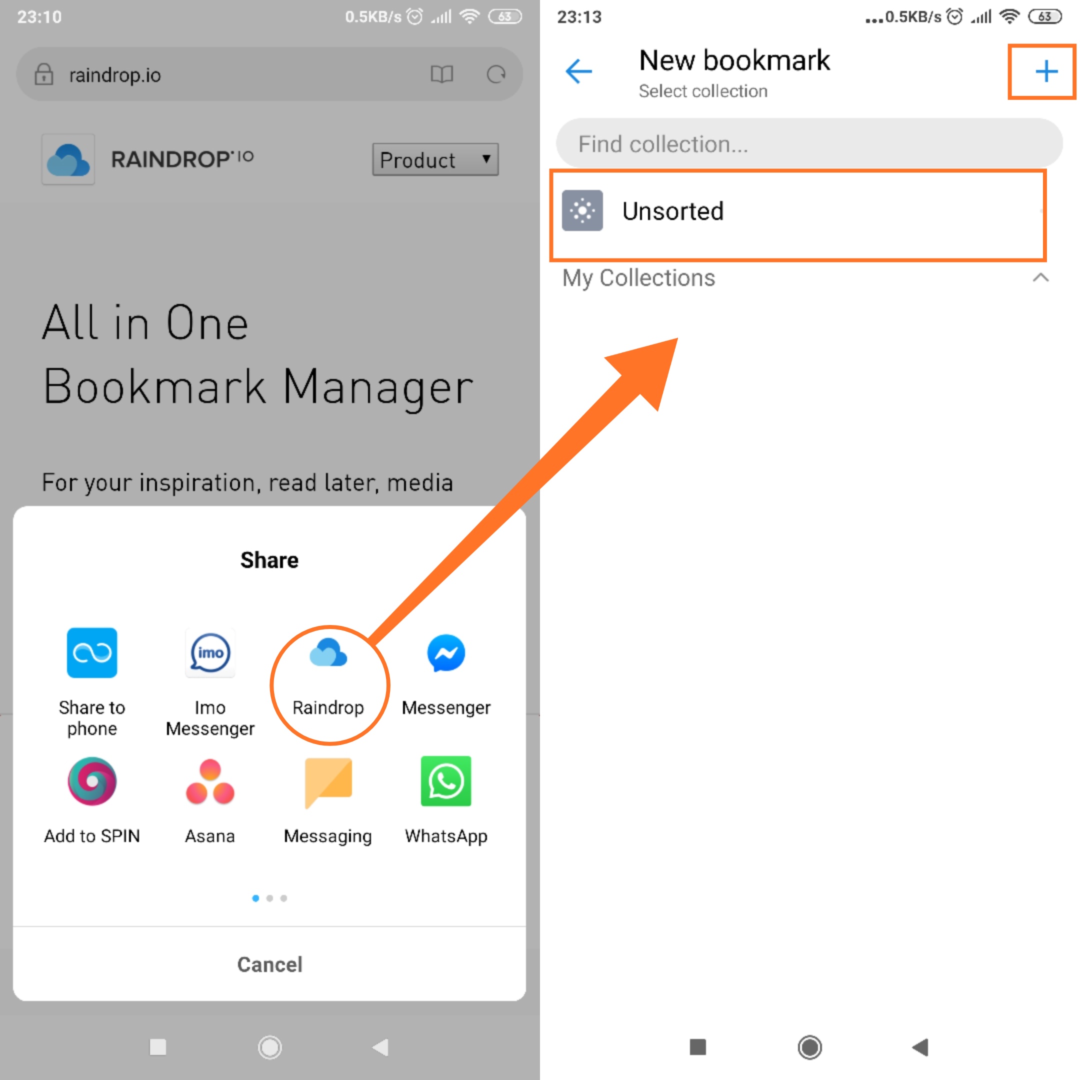 প্রথমে প্লেস্টোর থেকে Raindrop অ্যাপটি ইনস্টল করে লগইন করুন। তারপর আপনার ফোনের ব্রাউজার থেকে কাংখিত ওয়েব সাইট ব্রাউজ করুন এবং ব্রাউজার এর লিংক শেয়ার বাটনে ক্লিক করুন।
