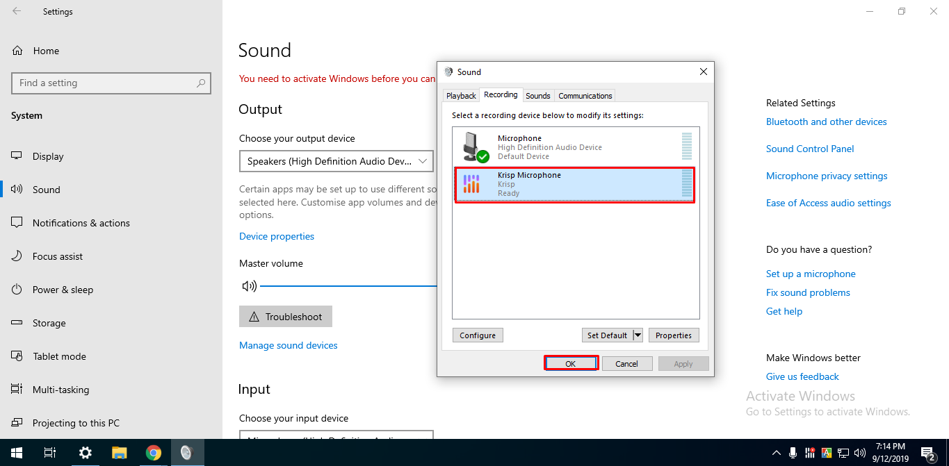 এখন Krisp সফটওয়্যার ইন্সটল করা শেষ হলে আপনার অপারেটিং সিস্টেম এর অডিও সেটিং এ যাবেন। সেখান থেকে মাইক্রোফোন এবং স্পিকার এর অপশনে Krisp সফটওয়্যারটি সিলেক্ট করুন। নিচের ছবি দেখুন আরও পরিষ্কার ভাবে বুঝতে পারবেন।