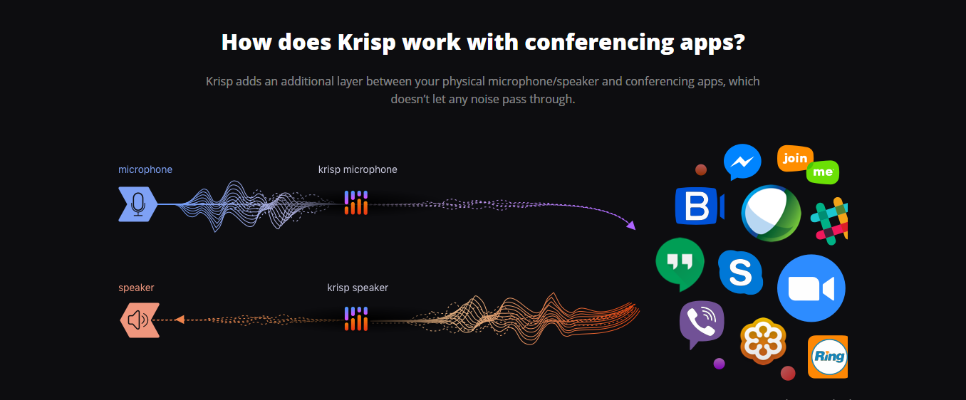 Krisp আপনার কম্পিউটার এর মাইক্রোফোন / স্পিকার এবং কনফারেন্সিং অ্যাপ্লিকেশনগুলির মধ্যে একটি অতিরিক্ত স্তর যুক্ত করার মাধ্যমে নয়েজ বা বাহিরের শব্দ ফিল্টার করে। নিচের ছবিটি দেখুন আরও ক্লিয়ার ভাবে বুঝতে পারবেন।