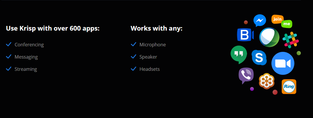 Krisp | Noise Cancelling App সফটওয়্যারটি ৬০০ এর বেশি অ্যাপ এর সাথে ব্যবহার করা যায়। ফলে সেই সব অ্যাপ বা সফটওয়্যার দিয়ে কনফারেন্স, কলিং ইত্যাদিও হবে নয়েজ মুক্ত একদম ক্লিয়ার ভাবে। এছাড়াও Krisp যেকোনো মাইক্রোফোন, স্পিকার এবং হেডসেট দিয়ে ব্যবহার করতে পারবেন।