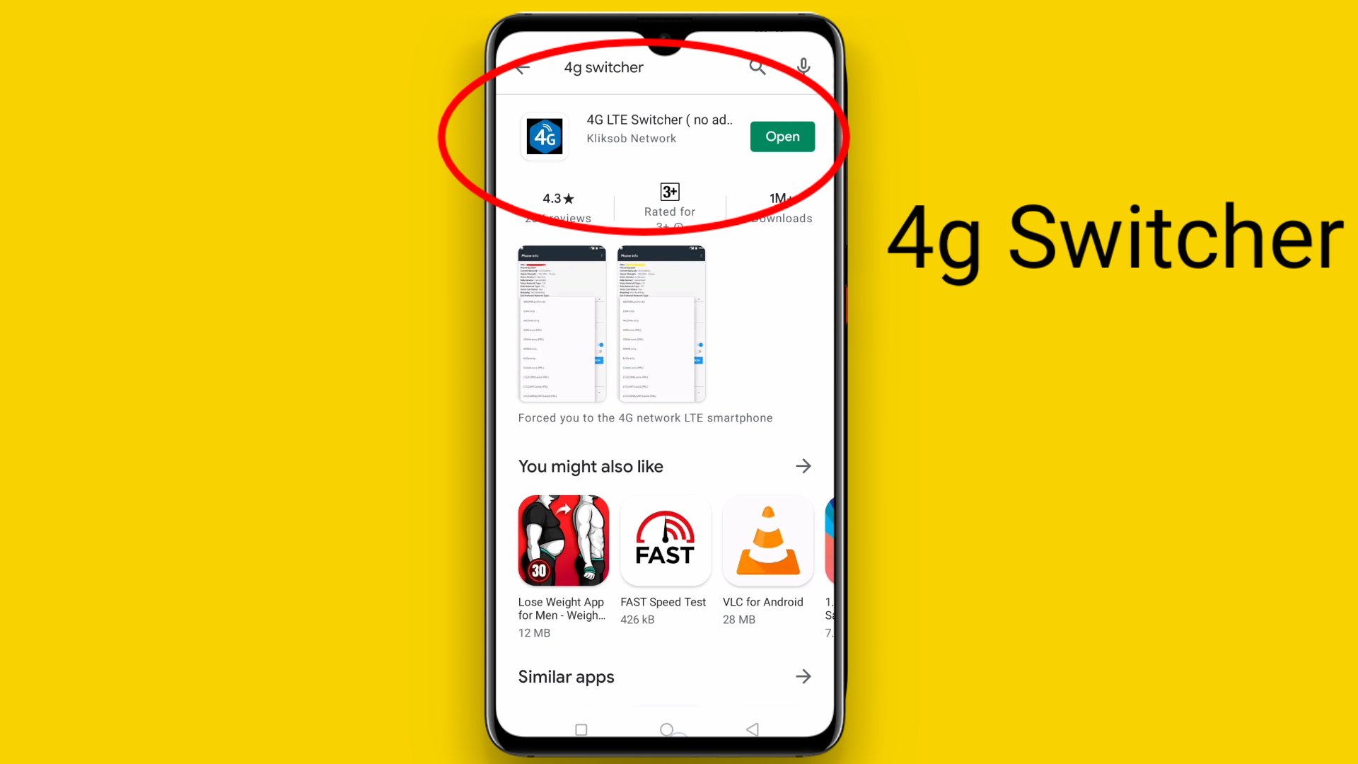 ১. এজন্য play store এ গিয়ে সার্চ বারে গিয়ে সার্চ করতে হবে 4G switcher। তাহলেই নিচের মতো একটি অ্যাপ পেয়ে যাবেন। যেটি আপনি ইনস্টল করে আপনার মোবাইলের হোমপেজে রেখে খুব সহজেই ৩জি থেকে ৪জি করে নিতে পারেন।