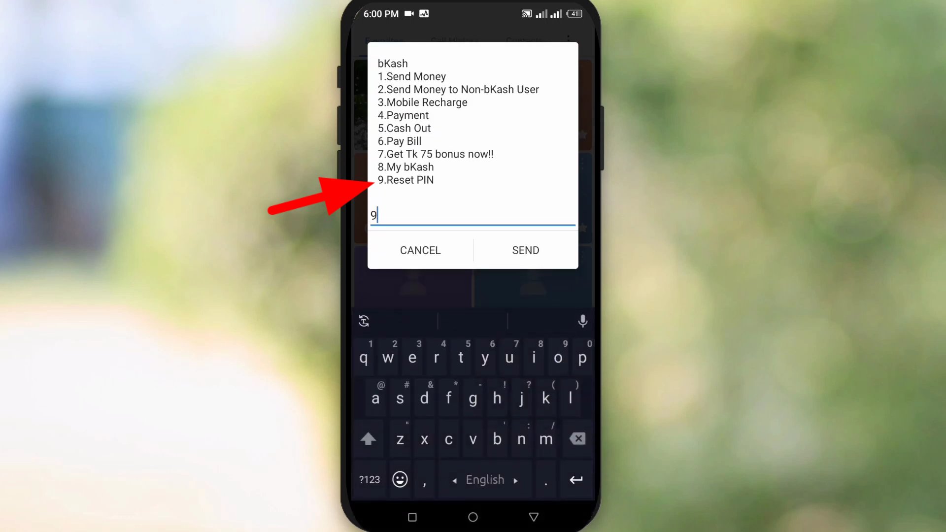 ২. এখন আপনি নিচে দেখতে পারবেন 9 নাম্বারে 9.Reset pin করার অপশন। এখন আপনি 9 তুলে Send করুন।