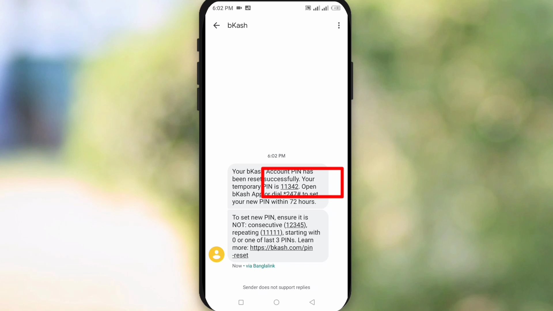১২. এই মেসেজে আপনাকে ৫ ডিজিটের একটি অস্থায়ী পিন জানিয়ে দেওয়া হবে। যেটি দিয়ে আপনাকে পিন পুনরায় সেট করতে হবে। এটি আপনি মনে রাখুন।