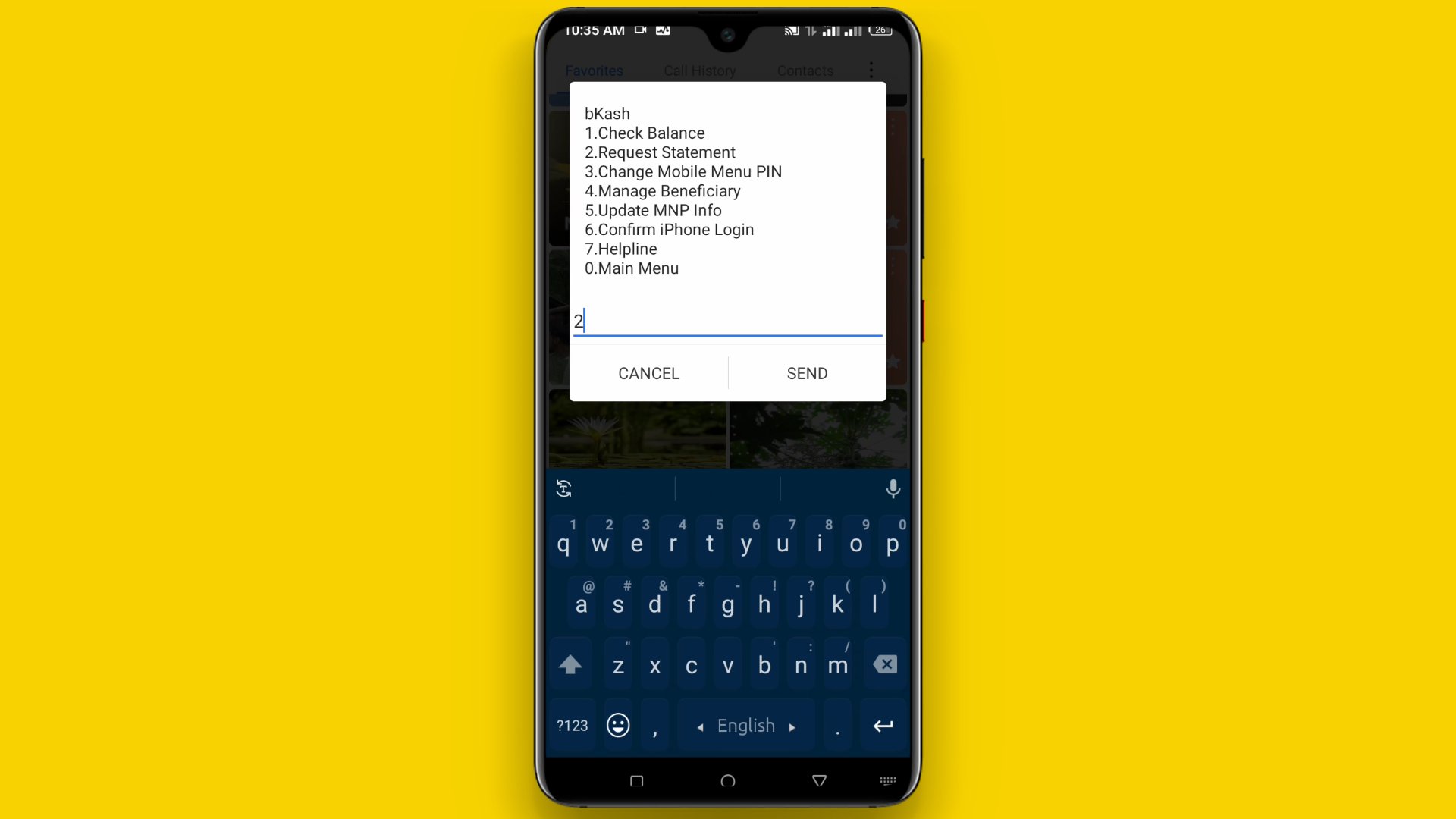 ৭. অর্থাৎ আপনার লেনদেনের তথ্যটি যদি ১ নাম্বারে থাকে তাহলে ১ তুলে Send করুন, ২ নাম্বার থাকলে ২ তুলে Send করুন।